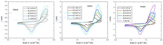Figure 6 shows the CV curves for assembled ZIBs using different currents for KMn8, KMn4 and HKMn. Their general aspect is similar to that previously found in other Mn-oxide ZIBs [,,]. From the second cycle, two reduction peaks appear at 1.30 and 1.20 V. An oxidation peak at 1.55 V and a small shoulder at 1.65 V are also observed at lower speeds, i.e., 0.1–0.3 mV s−1. The voltage values of each peak are dependent on the scan rate and the sample morphology. Thus, at higher rates (0.7 and 1.1 mV s−1) the CV curves exhibit one strong cathodic peak located at 1.28 V and the other peak is now seen as a shoulder at 1.18 V and even disappear for the sample HKMn. In the same way the anodic peak at 1.55 V disappears and the shoulder at 1.65 hexagonal (2H) increases in intensity.
