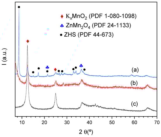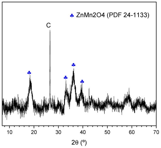 Moreover, this result has been supported by XRD data (Figure 9) of the HKMn electrode cycled at 30 mA g−1 rate until the battery stopped working. All maxima that appear were identified as the phase ZnMn2O4, neither maximum of ZHS or birnesite-type structure was observed.