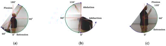 Movements of: (a) flexion–extension; (b) abduction–adduction of the arm (from that angle approximately, an additional DOF is made to reach (c) flexion–extension of the forearm.