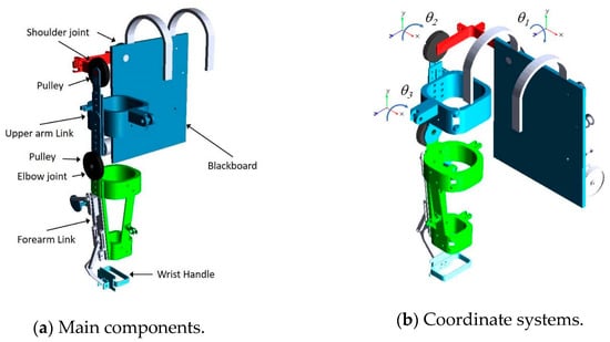 Figure 2a shows the exoskeleton for rehabilitation of the right upper extremity, indicating its main components. The exoskeleton is designed to place the motors in the base that is placed on the back of the user. The movement of the links of the arm and forearm will be made through cables connected to the motors. However, in this analysis, it is considered that the torques act directly on the shoulder and elbow joints in order to estimate the torque required in the engines when using cables. The three degrees of freedom to provide the movements of flexion–extension and abduction–adduction of the arm and flexion–extension of the forearm are shown in Figure 2b.