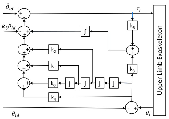 Model-based controllers are not easy to implement and cannot provide precise control in the human–exoskeleton interaction, because exoskeleton–human interaction factors and sensor noise do not allow the exact dynamic model to be taken into account. Therefore, several systems are controlled independently in the active joints [22,23].