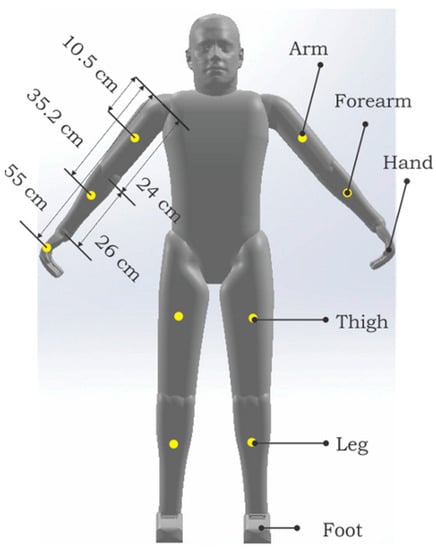 For the simulations, the anthropometric dimensions of the user in the exoskeleton were considered, as well as the forces that represent the weight of each segment of the limb. These simulations considered the weight of an average patient of 80 kg. Table 2 shows the center of mass length from the shoulder and the mass of each segment of the patient’s arm. The length to the center of mass of the segments for the patient’s arm, as well as for the segments for exoskeleton are shown in Figure 4. In this center of mass, the patient’s weight is considered to act as a disturbance not known to the controller and one which always remains in the direction of gravity.