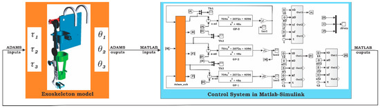 The simulation results were obtained by implementing the robust GPI controller in the virtual prototype, under the MSC Adams view® software environment, and in co-simulation with Matlab-Simulink® (Figure 5). From the virtual prototype, the signals of the exoskeleton link angles were sent to Matlab-Simulink®; in this software, the calculation of the robust GPI controller is carried out by tracking the desired trajectory, and the control input (torques) is sent to the virtual prototype.
