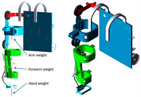 CAD view showing the architecture of the 3-DOF upper limb rehabilitation exoskeleton considering segment weights.