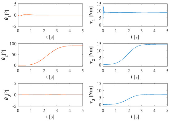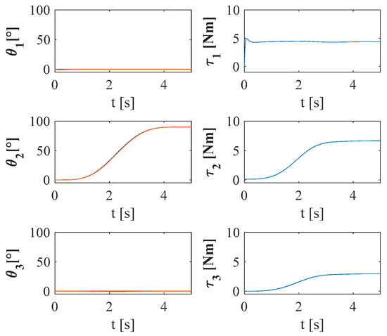 Figure 8 shows the response of the exoskeleton with the PID controller with trajectory tracking to achieve a 90° bending movement in 5 s. In this simulation, the weight derived from the limb of the patient to be rehabilitated was considered, as shown in Figure 6. It can be seen that trajectory tracking is adequate, considering the strength derived from the weight of the user’s arm and the parametric uncertainties. Although there were some deviations in the angles of and , these were less than 2 degrees, which may be imperceptible to the user, since it is not a sudden variation (sudden movement).
