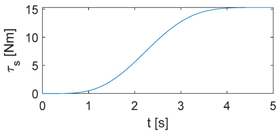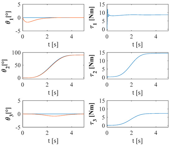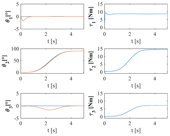 where represents the equivalent moment of inertia of the link where the torque is applied with the other joined links in which it performs the movement. The desired trajectory is denoted by and . The proportional, integral and derivative gains of the controller are and , respectively. By assigning poles, the controller’s gains were determined, which remained as: