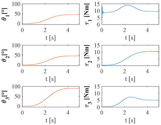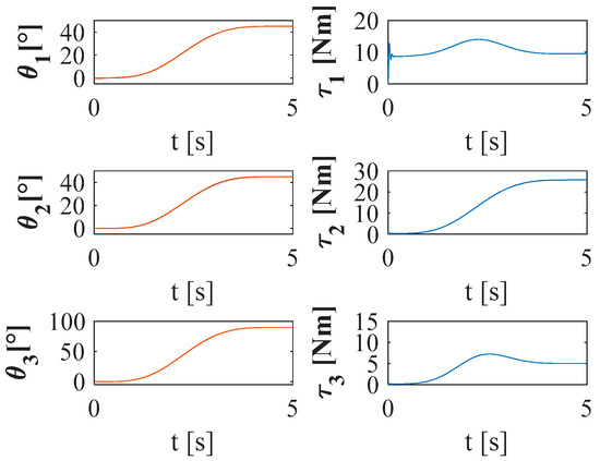 The exoskeleton response with the PID controller (4) with trajectory tracking to achieve a 90° bending movement in 5 s is shown in Figure 7. The Bézier polynomial Equation (17) was used to achieve a smooth movement, as shown for the angle . It is important to mention that in this simulation, the weight derived from the limb of the patient to be rehabilitated was not considered, only the inertia of the links. It is observed that there is a control effort in all the links to keep the exoskeleton in a flexed position.