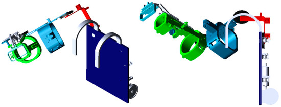 Two views of the virtual prototype of the exoskeleton are shown under the MSC Adams® software environment (Figure 6). In these, the forces that represent the weight of each segment of the patient’s arm can be appreciated. These forces enter as disturbances unknown to the controller and always act in the direction of gravity. The controller was given an approximate value of inertia (see Equation (4)), so there are also parametric uncertainties that the robust GPI controller compensates for. It is also shown that the controller is robust in the uncertainty of the gain of the controller, which represents the inertia of the system (link) [26].