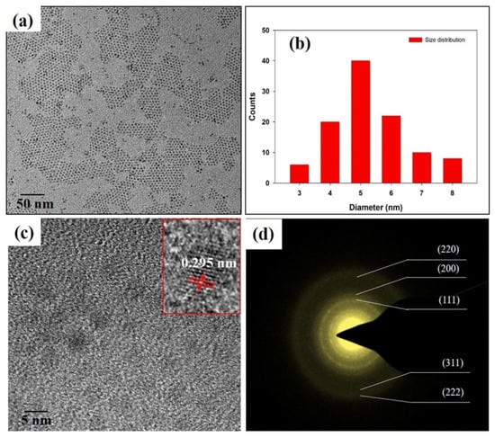 (a) Transmission electron microscopy (TEM) image of PbS nanoparticles, (b) size histogram of PbS nanoparticles, (c) high-resolution TEM image a PbS nanocrystal and (d) selected area electron diffraction pattern of PbS nanocrystal.