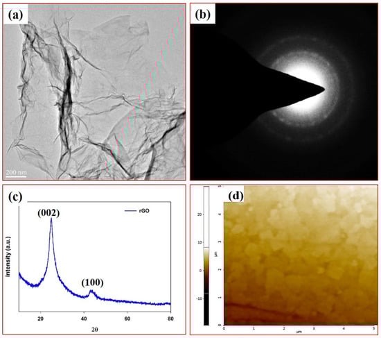(a) Transmission electron microscopy (TEM) image of rGO, (b) selected area electron diffraction pattern of rGO, (c) X-ray diffraction pattern of rGO and (d) surface morphology of rGO film on the glass substrate.
