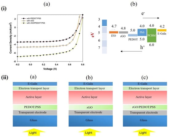 (i) (a) Current density-voltage curve of photovoltaic devices based on different hole transport layers and (b) the energy level alignment of devices with PEDOT:PSS as the HTL and rGO as the buffer layer. (ii) Device structure (a) ITO/PEDOT:PSS/PbS:PCBM/E-GaIn, (b) ITO/rGO/PbS:PCBM/E-GaIn, (c) ITO/rGO/PEDOT:PSS/PbS:PCBM/E-GaIn.
