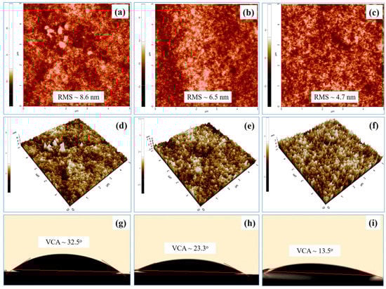 To improve the efficiency of the device, the morphology of the photoactive layer should be optimized. PEO is a good material to use as the buffer layer because PEO solubilizes well in water and many other organic solvents. Depositing PEO film without damaging the surface roughness of the active layer, and making it smoother, leads to improved device performance []. The PEO buffer layer with different spin-speeds (round per minute (rpm)) was inserted between the photoactive layer and back contact (E-GaIn) as an interface layer. The surface morphologies of the photoactive layer with spin-speeds of PEO were observed using atomic force microscopy (AFM) and video contact angle (VCA) techniques, as shown in Figure 4. The contact angle value is related to the film’s surface roughness and hydrophilic nature. A small contact angle value indicates that the film is highly hydrophilic and has low surface roughness.