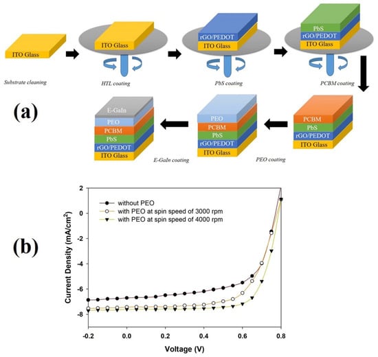 (a) Device fabrication process and (b) the current density-voltage (J-V) curves of the device without and with the PEO buffer layer.