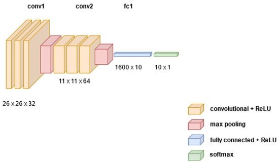 A simple CNN model with two convolution layers was trained on the MNIST dataset. The convolution filter used has a size of 5 × 5, with a stride of 1 and no padding. The MaxPooling filter was used at the pooling layer after the convolution step with a size of 2 × 2. We added dropout to regularize the model to avoid overfitting. The Log SoftMax was used at the output of the model to select one of the 10 classes predicted for an image. The Adam optimizer was used with default parameters and the model’s loss was computed using a negative log likelihood loss function. The structure of the convolutional neural network used is depicted in Figure 3.