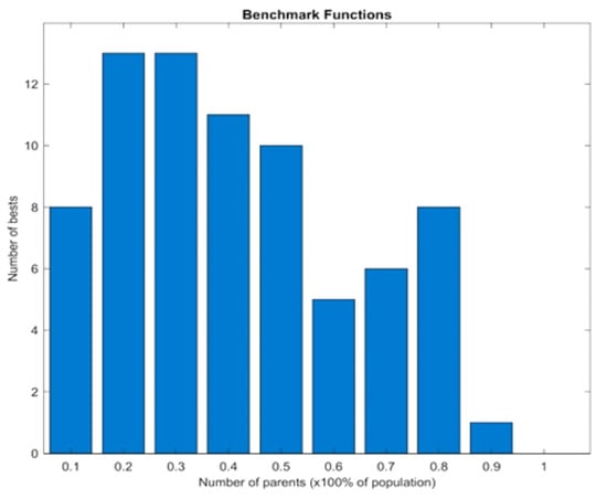 The least performance was at , which may be attributed to the fact that almost the entire population was considered as parents, thus effectively reducing the chance for exploitation through recombination. Furthermore, the fact that the 20% and 30% parent sizes yielded the same number of the best outcomes shows that there were no statistical differences between the two parent sizes. As a result, selecting any of the two parent sizes will result in the same performance. Summarily, Figure 4 simply indicates that the SDSGA achieves the best performance in 13 of the benchmark functions when the parent size was set to 20% and 30% of the total population.