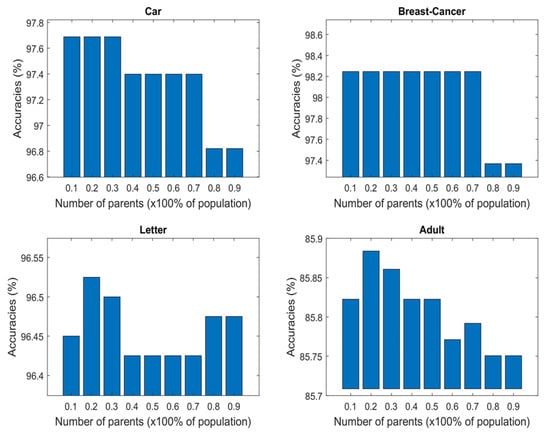 A similar study was performed on some UCI datasets, and it was discovered that a parent size of 20 and 30% yielded the best results when applied to different datasets, as shown in Figure 5. Nonetheless, we see a minor improvement in performance by the proposed SDSGA when a parent size of 20% was chosen and implemented on the LETTER and ADULT datasets as opposed to 30%. In the instance of the LETTER dataset, there was a modest improvement in accuracy from around 96.5% for a parent size of 30% to about 96.52% for the size of 20%, and, similarly, about 85.88% was recorded for the parent size of 20% compared to 85.86% recorded for the 30% parent size (see Figure 5). We should point out that the little change may not be statistically significant. As a result, the parent size of either 20 or 30% can be selected for evaluating the SDSGA.
