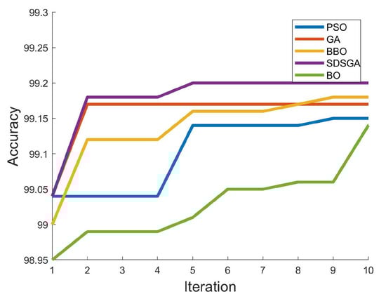 The BO algorithm performed the worst in terms of the number of fitness evaluations required for the algorithms to reach optimal, with 99.14% at the tenth iteration. This means that the BO had performed 150 fitness evaluations to reach this value. The best performing algorithm was the SDSGA, which achieved an accuracy of 99.2% at the fifth iteration. The BBO algorithm performed the next best and achieved an accuracy of 99.18% at the ninth iteration, whereas the GA achieved 99.17% at the second iteration. The accuracy of the BBO algorithm shows that it performed better than the GA and PSO algorithm. Despite gradually improving, its results have been consistently optimal across all runs. Figure 6 depicts a graph of the optimization algorithms’ accuracy as iteration progresses.