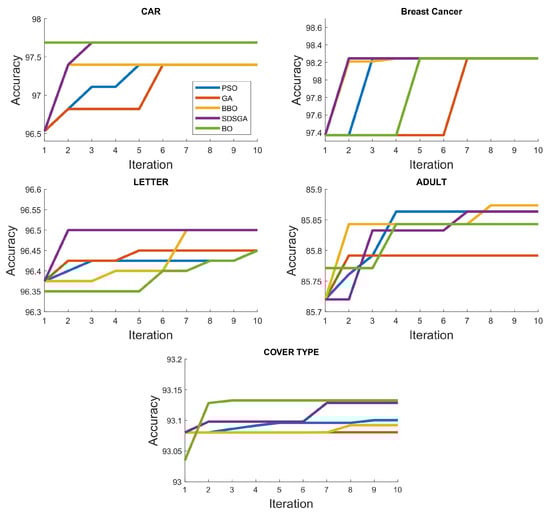 It has been observed that, because metaheuristic optimization algorithms are population-based, if the hyperparameter space is not large enough, these algorithms will converge very quickly to the optimal values. Because of its sequential nature, the BO tends to approach optimal values gradually. The progression of the BO algorithm in Figure 7 shows a straight line for the car dataset. This is due to the fact that the BO algorithm achieved its best solution during the first 15 fitness evaluations. Following that, it never achieved a higher value in any of the subsequent evaluations. It is observed in the BREAST CANCER dataset that, despite all algorithms being convergent to the same accuracy value, the number of iterations required to achieve this accuracy varies as it does in the other datasets. We note that GA’s remains average across all datasets, in contrast to the proposed SDSGA, which performed competitively well against the other optimization algorithms.