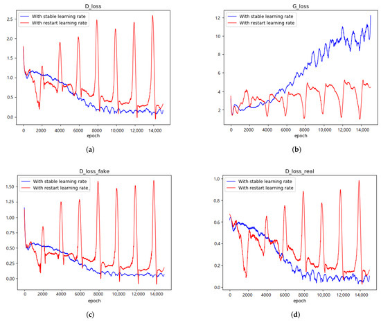 Loss lines with a constant learning rate (blue line) and restart learning rate (red line). (a) shows the losses in D where it is a composition of and , (b) refers to the losses in G, (c) illustrates the losses when D has predicted a target image as a generated image (), and (d) depicts the losses when D distinguishes a generated image as a target image ().