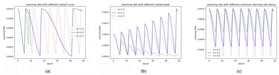 where is the count of current steps, indicates the number of steps that will be delayed in a cycle (Figure 2a), and is a cosine function. In order to prevent the value of the decay line lower than a certain value, we introduce into Equation (5). Figure 2c shows the value of learning rate with different values.