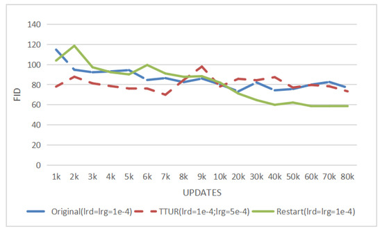 Ever since the advent of Generative Adversarial Networks [1], many studies have focused on ways to improve the quality and diversity of the generated images. Deep-Convolutional Generative Adversarial Networks (DCGAN) [2] are one of the examples which has shown significant improvements in the history of GANs research. DCGAN combines a GAN and convolutional network and imposes a series of constraints on the architecture to make it more stable. Since then, DCGAN-based architectures have been applied to different kinds of other GAN architectures. For example, Wasserstein distance was proposed as a standard measurement in [3]. Karras et al. [4] has proposed Progressive Growing of GANs (ProGAN) which is a progressive network training method that significantly improves the speed, stability, and quality of image generation. Large Scale GAN (BigGAN) [5] focuses on training networks in large scale, and improves the orthogonal regularization of generators to produce images with high fidelity and diversity. Self-Attention GAN (SAGAN) [6] generates details on a given image by allowing attention-driven, long-range dependency modeling for image generation tasks. A style-based Generator Architecture for GAN (StyleGAN) [7] improves the ability of GANs by fine-controlling the generated images, and thereby makes outstanding contributions to GAN synthesis. Sliced Wasserstein Generative Adversarial Networks (Sliced WGAN) [8] maps high-dimensional distribution to one-dimensional marginal distribution, which solves the problem of calculating Wasserstein distance in high-level space. The works mentioned above have extended the GANs’ architecture in order to achieve improved performance. However, the problem in terms of the instability and difficulty of training the GAN model remains not completely resolved [9,10,11,12]. In recent years, some researchers have focused on the study of the training process. It is well known that the judgment results of the discriminator provide an indication for updating generator parameters in GAN. Additionally, as aforementioned, the discriminator can be converged before the generator is well trained during the training phase. Therefore, the converged discriminator returns no gradient to the generator for updating its parameters. Arjovsky and Bottou [13] have discussed the phenomenon and argued that this problem is because the distribution of the generator is not continuous or the supports of generator and discriminator are disjoint. A solution in [13] is adding continuous noises to the inputs of the discriminator, therefore smoothing the distribution of the probability mass to ensure the discriminator is generated. Another one in [14] is an adaptive learning scheme for learning rate, which is carried out by comparing the KID score (proposed in [14]) from the previous iteration with KID score derived currently. The above two methodologies stabilize the GANs’ training process efficiently while they are also accompanied by extra heavy computing cost. The authors in [15] found a reasonable annealing scheme is a benefit for training GANs by avoiding model collapse. Different from the simple application in the above paper, our annealing scheme follows a cosine annealing function in each restart period and the peak values follow another annealing scheme in the whole process. The authors of [16] proved that the GANs models could converge to a local Nash equilibrium with different learning rates for training discriminator and generator, which reminds us of the feasibility to study the learning rate of the two networks separately.