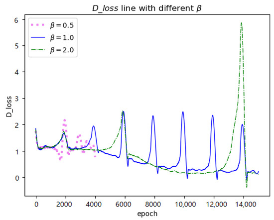 In order to analyze our method in detail, we have further explored the influence of four important parameters in the method on the experiment results and which are shown in the following parts. The four parameters are (cycle length control coefficient), (peak value control coefficient), (the baseline of amplitudes), and P (the number of steps in the first cycle), respectively. As we have discussed in Section 2.2, the line of Figure 1a shows the convergence of D which will influence the final output. Therefore, we have investigated the influence of our method in two ways: (1) the convergence of loss of D and (2) the result in terms of FID. Besides that, we consider the modification of the parameter settings that can prevent the fast convergence of D and ensure the effectiveness during the training process.