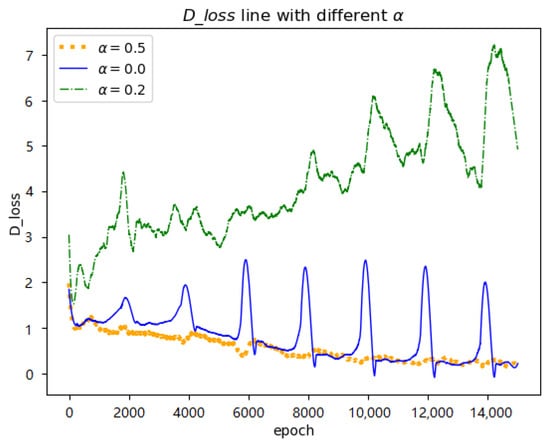 In the ablation study of four parameters (, , , and P), we always explore the impact of different values of a parameter when the other three parameters remain unchanged. Based on the analysis of generated results (FID score), we select three representative values to see their impact on the discriminator loss curves.