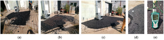(a) Support layer uniformity; (b) incorporation of copper register and coating with 5 cm of BA8 asphalt; (c) stand after compaction; (d) monitoring of solar radiation level with Ahlborn Star Pyranometer FLA 628 S; (e) monitoring of temperatures with Ahlborn acquisition station and K-type thermocouples.