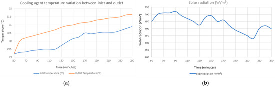 In order to evaluate the feasibility of thermal energy recovery from CSA, a constant flow pump was used to circulate the cooling agent in CSA during several summer days. An Ahlborn Almemo data logging station was used to monitor these temperatures, and K-type thermocouples were used as temperature sensors and mounted in several areas of the experimental setup (top asphalt layer, 2.5 cm depth, the surface of the copper pipes, air temperature, etc). Previously, the thermocouples were calibrated using a thermostatic bath. This configuration was chosen to take into account the low thermal capacity of the pipe wall. The graph in Figure 3a shows a sample of data measured during the validation period of the experimental setup and highlights the temperature variations of the cooling agent, observing the increase in its temperature. Throughout the monitoring of the CSA system, monitoring of the variation of direct and indirect solar radiation was performed in parallel using an Ahlborn Star FLA 268S pyranometer. Figure 3b shows the variations in the solar intensity monitored during the in situ measurements.