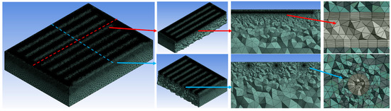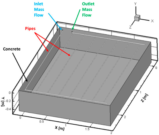 The numerical case has the dimension of 2600 × 2000 × 500 mm, with the pipes incorporated at a depth of 40 mm from the surface. The calculation grid contained 9.7 million tetrahedral elements. The “inflation” option was used for generating boundary layers, resulting in five boundary layers at the level of the pipes with a smooth transition, depending on the size cell and the number of cells in the respective area. At the same time, in order to improve the quality of the elements, the high smoothing mesh option was used.