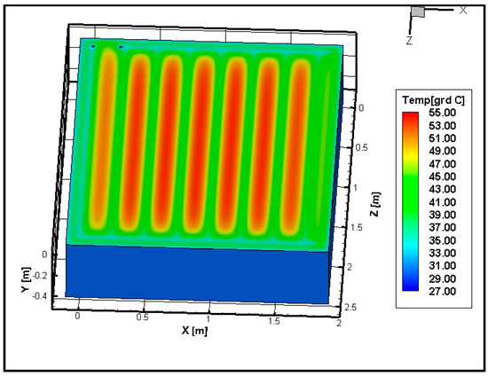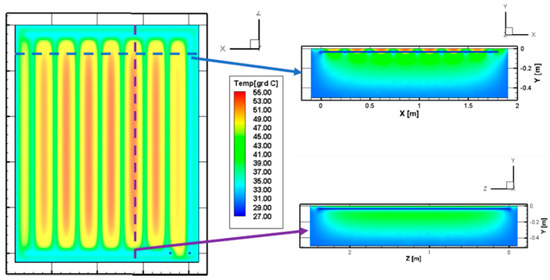 The numerical model took into consideration the heat transfer through conduction (asphalt and pipes) and radiation (sun radiation). As a simplifying hypothesis regarding the air force convection, it was shown in previous studies that heat transferred through air force convection has a very small proportion in the total heat transfer [25,26]. Of course, this transfer method is also subject to the context of the location (geographical area, surroundings, etc). Due to this fact, and in order to avoid overwhelming the case with a large number of cells, it was chosen to simulate the study without convection and compare the results from both approaches. If the compared results had shown divergences, the addition of forced air convection would have been taken into account. The numeric simulation through the pipes was governed by fluid mechanics (the equation of mass, momentum, and energy conservation) and heat transfer (forced convection). Results from the numerical model can be seen in Figure 7, where temperature fields are presented in section and frontal plane, while a isometric view can be seen in Figure 8.