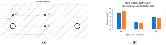 The thermocouples’ positions are presented in Figure 9a. The differences between the numerical and the experimental model are based on the variation of the value of the solar radiation (dynamic) in the case of the experimental setup compared to the numerical model, in which it had a constant value. Results are presented in Figure 9b.