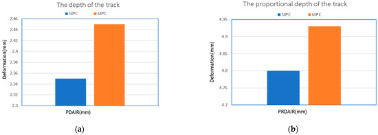 At the end of the measurement campaign, several tests were performed by a nationally accredited laboratory to evaluate the behavior of the asphalt mixture at different temperatures and to highlight a favorable behavior at lower temperatures (RDAIR—depth of the track and PRDAIR -the proportional depth of the track, at 50 °C and 60 °C, respectively). The temperature setpoints used for the tests were set based on the values measured during the experimental campaign. The test results are presented in Figure 10a,b, respectively, demonstrating the validity of the premises which estimated superior mechanical properties of the material.