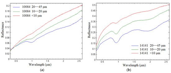 The research material is the results of measurements in the Earthβs laboratory on samples transported from the moon, and the reflectance measurements are taken at Brown University, and the dataset is publicly available, and can be freely accessed βhttps://www.planetary.brown.edu/relab (accessed on 10 January 2022)β. LSCC (Lunar Soil Characterization Consortium) lunar soil sample data consists of 10 lunar highland lunar soil samples collected by Apollo 14/16 and 9 lunar soil samples collected by Apollo 11/12/15/17. These data are widely used in the field of lunar research, including lunar soil spectrum, mineral composition and content, particle size, maturity and other information, which have a high degree of recognition and authority (http://apps.geology.brown.edu/RELAB.php accessed on 10 January 2022). All the spectral data of LSCC are measured in Brown Universityβs RELAB laboratory under the conditions of an incident angle of 30 degrees and an exit angle of 0 degrees. LSCC is the only complete βground realityβ data on the moon, including the reflectance spectra and mineral abundance information of lunar regolith [5]. LSCC consists of 10 samples of lunar highland collected by Apollo 14/16 and 9 samples of lunar mare collected by Apollo 11/12/15/17 [10,11,12]. All the 19 original samples have been subdivided into four groups of <10 ΞΌm, 10β20 ΞΌm, 20β45 ΞΌm and <45 ΞΌm according to the particle size, a total of 76 samples. The reflectance spectra of all samples and the mineral content of the first three particle size groups have been measured by RELAB Laboratory of Brown University. All spectra were obtained at i (incident angle) = 30 degrees, e (emergence angle) = 0 degrees, and g (phase angle) = 30 degrees. The spectral resolution is 5 nm, forming a spectral database of 460 bands from 300 to 2600 nm [9,10].