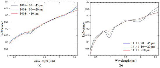 Three particle size groups < 10 ΞΌm, 10β20 ΞΌm and 20β45 ΞΌm were selected in this paper which have both spectral data and mineral abundance information. The particle size group of <45 ΞΌm lacks mineral content information and is not considered as the research object. Plagioclase is widely distributed in the lunar sea and lunar highlands. Plagioclase in the lunar soil is poor in sodium and rich in calcium, and has relatively strong absorption near 0.65 Β΅m and 1.25 Β΅m, but it is not easy to observe in the lunar soil. This is because the absorption characteristics of plagioclase are weaker than other strong absorption minerals and can easily be concealed. By decomposing and filtering data information, PLS extracts the most explanatory comprehensive variables for dependent variables, identifies the information and noise in the system, and better overcomes the adverse effects of multiple correlations of variables in system modeling. The mineral contents of lunar mare and lunar highland are different. Lunar highland contains more plagioclase, so the spectra of lunar mare (Figure 1a) and the spectra of lunar highland are quite different (Figure 1b). Besides, plagioclase is widely distributed in the lunar sea and lunar highlands. Plagioclase in the lunar soil is poor in sodium and rich in calcium, and has relatively strong absorption near 0.65 Β΅m and 1.25 Β΅m, but it is not easy to observe in the lunar soil. This is because the absorption characteristics of plagioclase are weaker than other strong absorption minerals and can easily be concealed. By decomposing and filtering data information, PLS extracts the most explanatory comprehensive variables for dependent variables, identifies the information and noise in the system, and better overcomes the adverse effects of multiple correlations of variables in system modeling. Therefore, 27 samples of lunar mare and 30 samples of lunar highland were selected and modeled separately. When modeling the samples of lunar mare and lunar highland respectively, two-thirds of samples were randomly selected as the experimental group to establish the prediction relationship, while the remaining one-third of the samples were used as the verification group to further verify the prediction relationship.