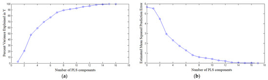The p-independent variable matrix X = {} and q-dependent variable matrix Y = {} of n samples are decomposed. Components and are extracted from X and Y. is a linear combination of and is a linear combination of . When extracting these two components, and should carry as much variation information as possible in their respective data tables, and the correlation degree of and can reach the maximum, which ensures that and represent matrix X and Y as well as possible and independent variable component has the strongest explanatory power for dependent variable component . After extracting the first components and , partial least squares regression is applied to the regression of X to and Y to , respectively. When the regression equation reaches the required precision, the algorithm will be terminated. Otherwise, the residual information after X and Y are interpreted by and respectively will be used for the next round of component extraction, so that the cycle can be completed until the required precision is reached. If the components are extracted from the independent variable matrix X, the partial least squares regression will establish the regression equation of the dependent variable matrix Y and , and then be expressed as the regression equation of the dependent variable matrix Y and the independent variable matrix X.