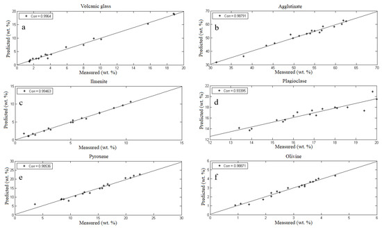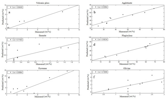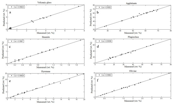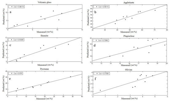 As far as the mineral content retrieval of lunar highland, 20 randomly selected samples from 30 highland samples were used to model the spectra and mineral content of lunar regolith based on PLS method, as shown in Figure 5. The mineral contents of volcanic glass (Figure 5a), agglutinate (Figure 5b), ilmenite (Figure 5c), plagioclase (Figure 5d), pyroxene (Figure 5e), and olivine (Figure 5f) in the lunar regolith were optimized and retrieved, and compared with the measured mineral contents in the lunar regolith.