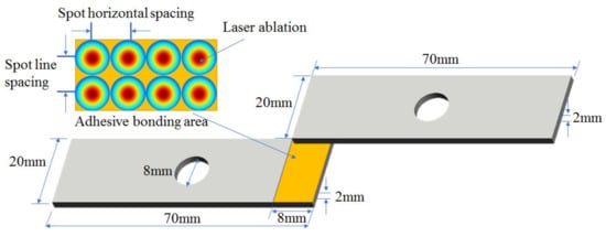 Al alloy (2A12) is a relatively high strength duralumin material, which is a composition of Cu (3.8–4.9%), Mg (1.2–1.8%), as well as smaller percentages of Ag, Ni, Fe, Si, Mn, Zn and Ti. The material used in this study was pre-cut into small plates with dimensions of 70 mm × 20 mm × 2 mm. In the middle of the plates, a hole with a diameter of 8 mm was prepared to ensure subsequent shear strength tests. After pre-treatment, the sample surface was rinsed with alcohol to rid of the impurity. Seen in Figure 1, two samples under the same treatment condition were pasted with 8-mm overlap, which was adhesive bonding area and pre-treated with laser ablation, and then cured using jig under high pressure for several hours.