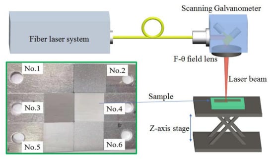 The experiment setup for surface treatment was presented in Figure 2. Nanosecond laser pulses were emitted by a commercial fiber laser system (IPG Company, New York, NY, USA), and then delivered to a scanning Galvanometer (Scanlab Company, Puchheim, Germany). The maximum laser power was 30 W, the average laser wavelength was 1064 nm and the pulse width was 100 ns. Passing through an F-θ field lens with 160-mm focal length, the laser beam was focused to be a spot with diameter 30 μm at 1/e2 of the maximum laser intensity. To ensure the laser focusing on the top surface of samples, the distance between the laser spot and the samples was adjusted by Z-axis lifting stage. The line spacing of laser spot (ranged from 10 μm to 100 μm) and the scanning speed (ranged from 100 mm/s to 10,000 mm/s) were accurately controlled with the scanning Galvanometer. The inset of Figure 1 showed pictures of an untreated sample (No.1), a sandblasted sample (No.2) and four laser-treated samples (from No.3 to No.6).