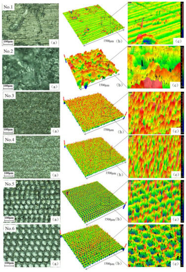 Topography and surface roughness test diagram of No.1–No.6 sample. (a) Topography was measured by optical microscope; (b,c) Surface roughness was measured by white light interferometer.