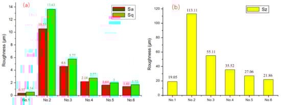 Surface roughness of No.1–No.6 Sample. (a) Values of Sa and Sq; (b) Value of Sz.