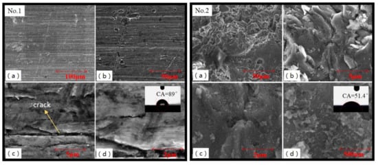 Shown in Figure 5, the microstructure and contact angle of No.1 and No.2 samples were measured by SEM and contact angle measuring instrument. Alcohol was used to clean oil stains on the surface of the No.1 sample. After cleaning, there was still a layer of loose and uneven oxide film on the surface [29], which reduced the surface energy of Al alloy. The wettability of the No.1 sample was affected. There was a small physical adsorption force between droplet and Al alloy surface results in small mechanical meshing force [30] and a contact angle of 89°. There were obvious rolling cracks on the surface of Al alloy; these cracks were easy to be the source of crack propagation during service. The metal surface of the No.2 sample was coarsened and purified by random collision and repeated scouring of sand particles. Impurities, such as oxide on the substrate surface, were removed. Large bumps and pits appeared on the surface of the No.2 sample, which were in no obvious directionality, with multi-scale and random characteristics. After sandblasting, its contact area increased and the surface wettability improved with a contact angle of 51.4°. Micro-pits, scratches and furrows generated on the sample surface played the role similar to mechanical occlusion, anchoring and nailing [30]. Thus, the wettability of Al alloy was improved after sandblasting.
