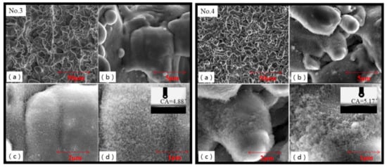 Because the hemispherical melting region impacted by laser beam overlapped with each other, the interaction of stacking and extrusion was enhanced and the surface of the No.3 and No.4 samples forms a uniform rough structure, seen in Figure 6. This increased the contact area between the droplet and the samples. The surface contact angle of No.3 and No.4 sample was 4.88° and 5.17°, respectively. Figure 6a showed a large number of “micron clusters”, which formed a uniform “coral” rough surface. According to the mechanical interlocking theory [31], the adhesive formed a stronger mechanical interlocking force on the surface, which increased the bonding area and then improved the bonding performance of the sample. Figure 6c,d shows the surface of “micron cluster” covered with a large number of nano-floc structures. The micro–nano composite structures further increases the contact area between the droplet and the material. When the droplet filled the pits on the surface of the coarse micro–nano structure of the flocculent, the droplet was completely sucked into the surface and formed infiltration. The surface of Al alloy became hydrophilic. It should be noticed that WLI and SEM methods both provided surface morphology, however, their test diagram did not appear the same thing [32,33]. Because of higher resolution in the Z direction for the WLI method, the spikes and pits in WLI images seemed taller with sharper appearance than in SEM images. Furthermore, as SEM overcame the limitations of the optical diffraction, the magnification of SEM images was up to 1000 times larger than WLI. As a result, micro–nano composite structures could be seen in SEM images.