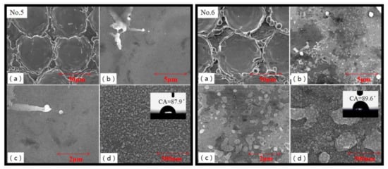 Figure 7a showed that circular pits were regularly arranged on the surface of No.5 and No.6 samples when the distance between laser spots was equal to or greater than the diameter of the melting zone. From the accumulation phenomenon at the edge of pits, it implied that the main reason for the formation of pits was not material evaporation. It was formed by the impact of laser melting to melt the metal and pushed out of the molten pool. The edge of the pits showed irregular independent mastoid structures. Figure 7d showed a dense layer of granular nano protrusions on the surface of the pit, which did not produce floccule. The surface contact angle of No.5 and No.6 sample was 87.9° and 89.6°, which was similar to that of untreated subtract. Air might exist in the uniform pits and mastoid structures of the sample surface when the droplets contacted with Al alloy. The droplets were pushed out and could not get in. Therefore, the contact area between droplet and the samples was small, which performed as hydrophobicity.
