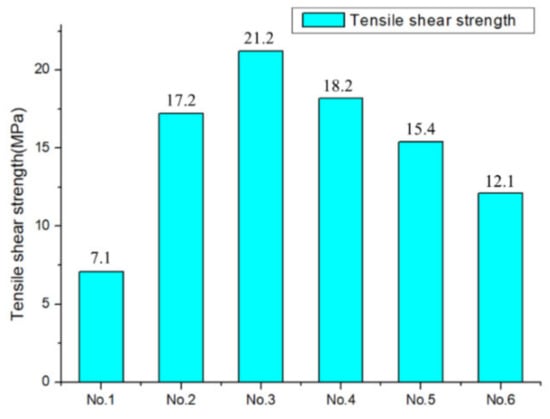 Seen in Figure 9, the shear strength of samples after treatment became larger, as the original sample was 7.1 MPa. By sandblasting, a certain amount of dirt remained in pits that mad adhesive difficult to enter. This led to interfacial voids and defects, which were easy to form a “weak interface layer” and reduce the shear strength after bonding. In addition, the particles adhered to the sample surface after sandblasting, which reduced bonding strength. After laser treatment, the shear strength of No.3 and No.4 samples was better than that by a sandblasting treatment of 17.2 MPa. The shear strength of Al alloy was controlled just by changing the laser spot distribution. By decreasing the spot spacing to smaller than 30 μm, which was the diameter of the laser spot, micro–nano structures were induced by multipulse interaction. Due to the hemispherical melting region of laser beam impact overlap, micro–nano composite structures were formed on the No.3 and No.4 sample surface, which increased the contact area between the adhesive and the metal. No.5 and No.6 samples had uniform pits and mastoid structures with air. The adhesive was squeezed out, which resulted in a smaller contact area and weaker bonding performance.