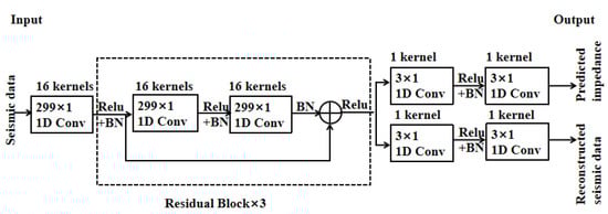 The single-task network used in this paper is a FCRN from Wu et al. [23], and the multi-task network is a hard parameter sharing network developed from the single-task FCRN. The multi-task network structure is shown in Figure 1. In order to better capture the low-frequency characteristics of seismic data, the first convolution layer of FCRN has 16 kernels of size 299 × 1. After the first convolution layer, three residual blocks are stacked, and each residual block is composed of two convolution layers. The first layer and the second layer, respectively, have 16 convolution kernels of size 299 × 1 and 3 × 1. To enable the network to complete multi-task inversion, two output channels are set after the residual block. Each output channel contains two one-dimensional convolution layers, and each one-dimensional convolution layer has a kernel of 3 × 1. The convolution step size is 1, and zero-padding is used to all convolution layers to ensure the same input and output sizes. Rectified linear unit (ReLU) and batch normalization (BN) are introduced into the network to accelerate network training and convergence.