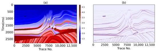 Marmousi2 model dataset: (a) impedance; (b) synthetic seismic data generated by 30 Hz 0° phase Ricker wavelet.