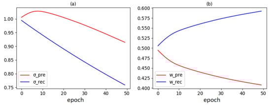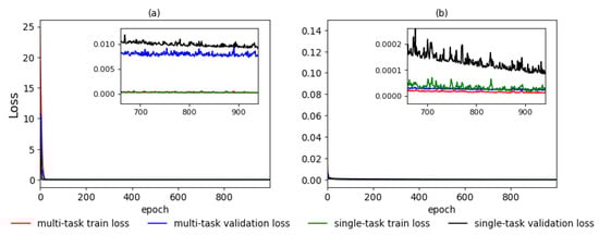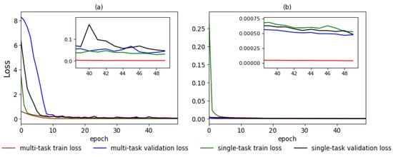 The validation Mean Squared Error (MSE) of the two tasks with different weights is shown in Table 1. The training/validation procedure was executed five times and the average results were output for comparison. The performance of the model for a single task is shown in the first and last rows. When the validation loss is minimal during the 50 epochs, the corresponding = 0.890 and = 0.759, then we can calculate that the optimal weight for impedance prediction and seismic data reconstruction is 0.421:0.579 by Equations (5) and (6). Figure 3 shows the variation at different epochs of , and the corresponding , . Under this optimal weight, the validation MSE of the two task is 0.0365 and 0.00054. Compared with results in Table 1, it can be seen that the MSEs of the multi-task network of the two tasks under different weights are smaller than that of the single-task network, and the optimal weight determined by the proposed method makes the MSE smaller for both tasks, which proves the effectiveness of the method. The training and validation loss curves of different tasks under the optimal weight are shown in Figure 4. Figure 5 illustrates the profiles predicted by the single-task network (Figure 5a) and the hard parameter sharing multi-task network (Figure 5b) with the optimal weight for visual comparison. The MSEs of the profiles predicted by the single-task network and the hard parameter sharing multi-task network are 0.0478 and 0.0353, respectively, which proves the advantage of the hard parameter sharing multi-task network from a quantitative perspective.