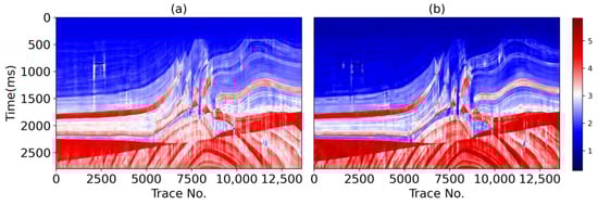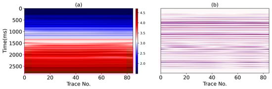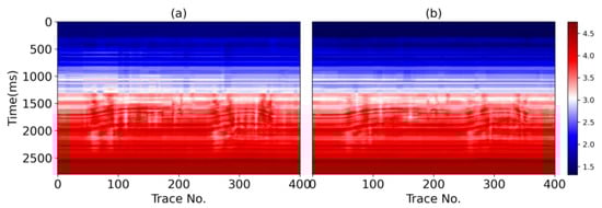 The impedance of the Marmousi2 model and its corresponding synthetic data are the same as in [23], and are shown in Figure 2. For this model, 101 traces were selected from the synthetic seismic data and impedance data as the training set through isometric sampling, and 1350 traces were randomly selected from the remaining 13,500 traces as the validation set and the whole 13,601 traces comprised the test set. The Adam optimization method was adopted in this paper. The weight decay rate was set to 1 × 10−7. The learning rate was set to 0.001. The number of epochs was set to 50, and the batch size was set to 10. The above hyperparameters and network structure were decided from an ablation study by adjusting the convergence of the training set and the validation set. The training of the network was implemented under the PyTorch framework, and a GPU was applied to accelerate the calculation.