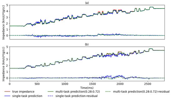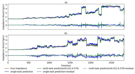 To further demonstrate the effectiveness of the proposed method, Figure 6 shows the results of impedance prediction for the 731st (Figure 6a) and 8991st (Figure 6b) trace data points. We can see that the impedance predicted by the hard parameter sharing multi-task network (green) matches the true impedance (red) better than that of the single-task network (blue). The blue and green dotted lines in Figure 6 represent residuals between the true impedance and the impedance predicted by the two networks. Table 2 shows the Pearson Correlation Coefficient (PCC) between the predicted value and the truth. Under the optimal weights, the PCC between the predicted value and the ground truth of the 731st and 8991st traces of the multi-task network (third column) are both higher. We also tested the tolerance of the two networks to noise. We added six levels of Gaussian noise with a signal-to-noise ratio (SNR) of 0, 5, 15, 25, 35, and 45 dB to the test dataset. The MSEs between the prediction of different SNR data and the true impedance are presented in Table 3, and shows that the accuracy of the multi-task network is higher than that of the single-task network under all six test datasets with different SNRs. This further proves the superiority of the method in this paper.